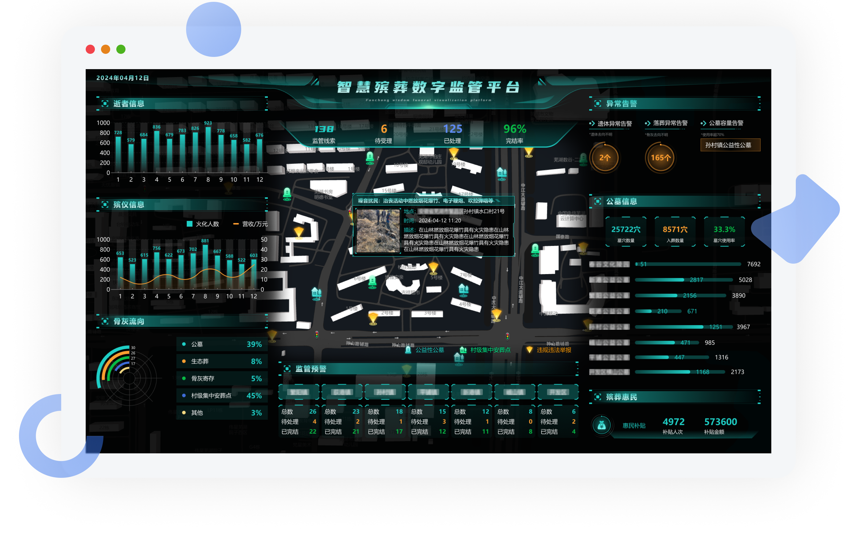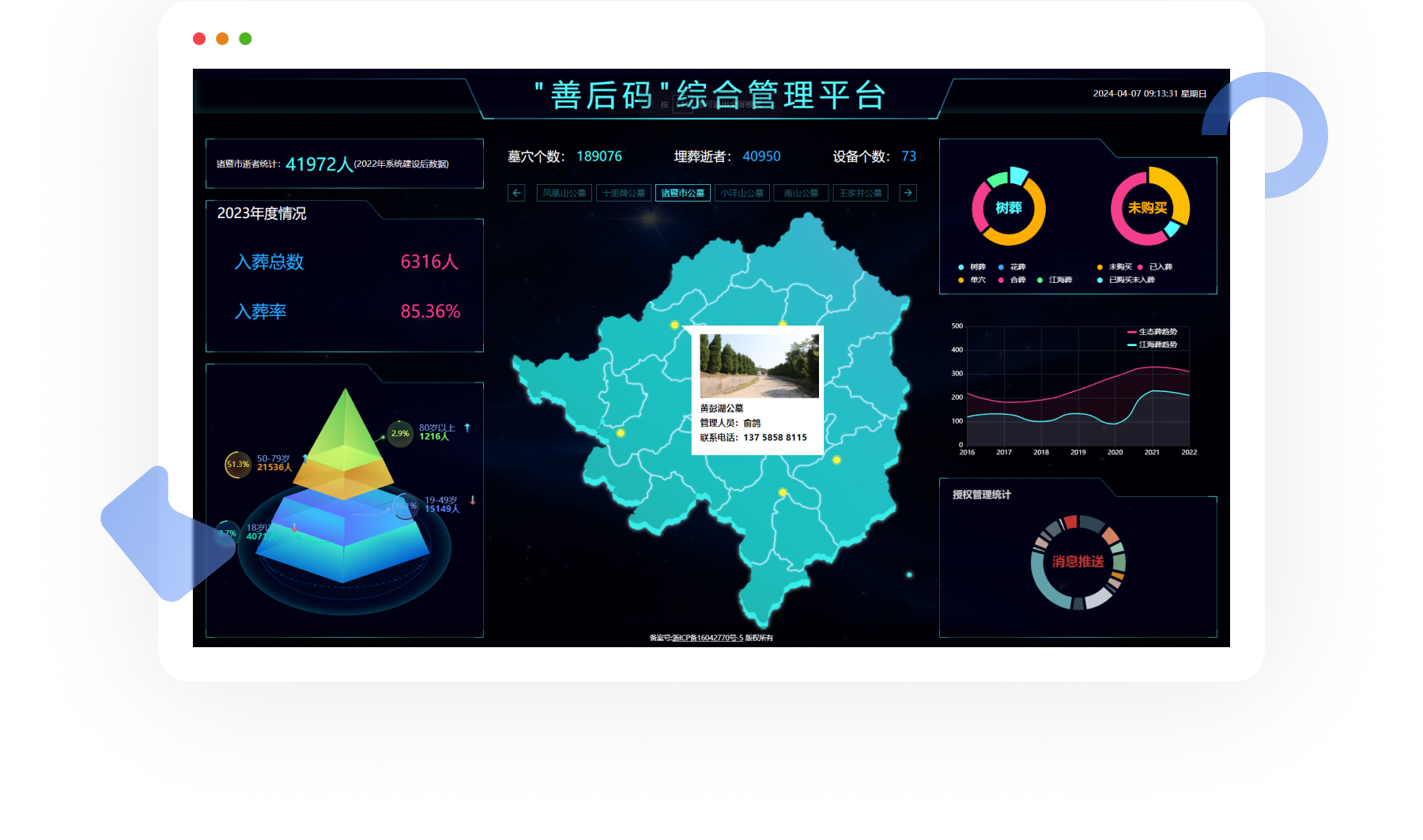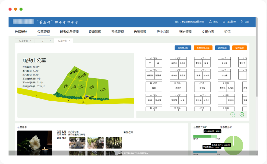 实现对诸暨市范围内公墓的精确管理和日常业务、资源的管理,提高公墓管理业务的办事效率,提升陵园的安全管理水平,提升民政业务的管理效率,在满足殡葬的功能需求的同时,更好地满足生命祭祀纪念文化的精神追求。