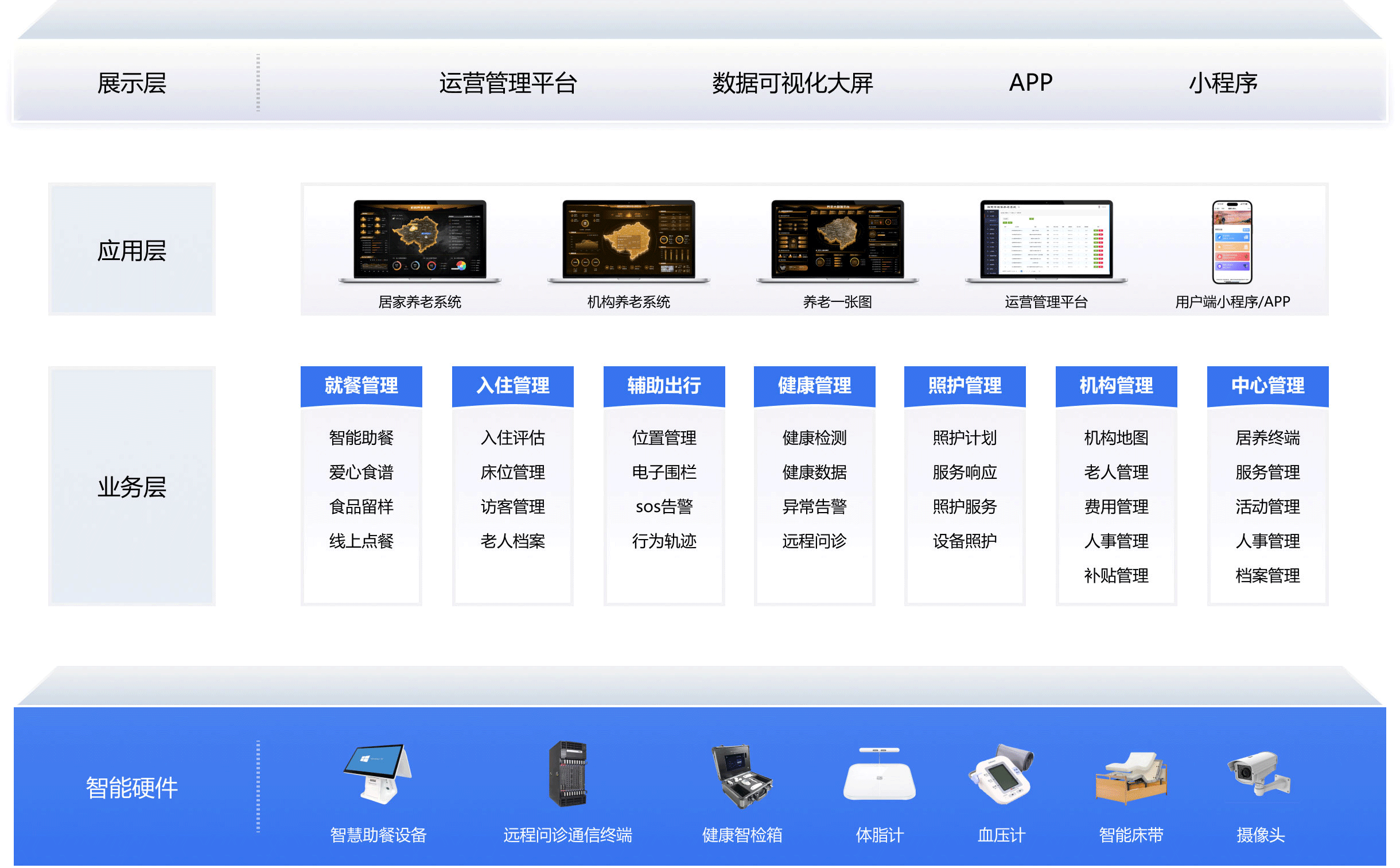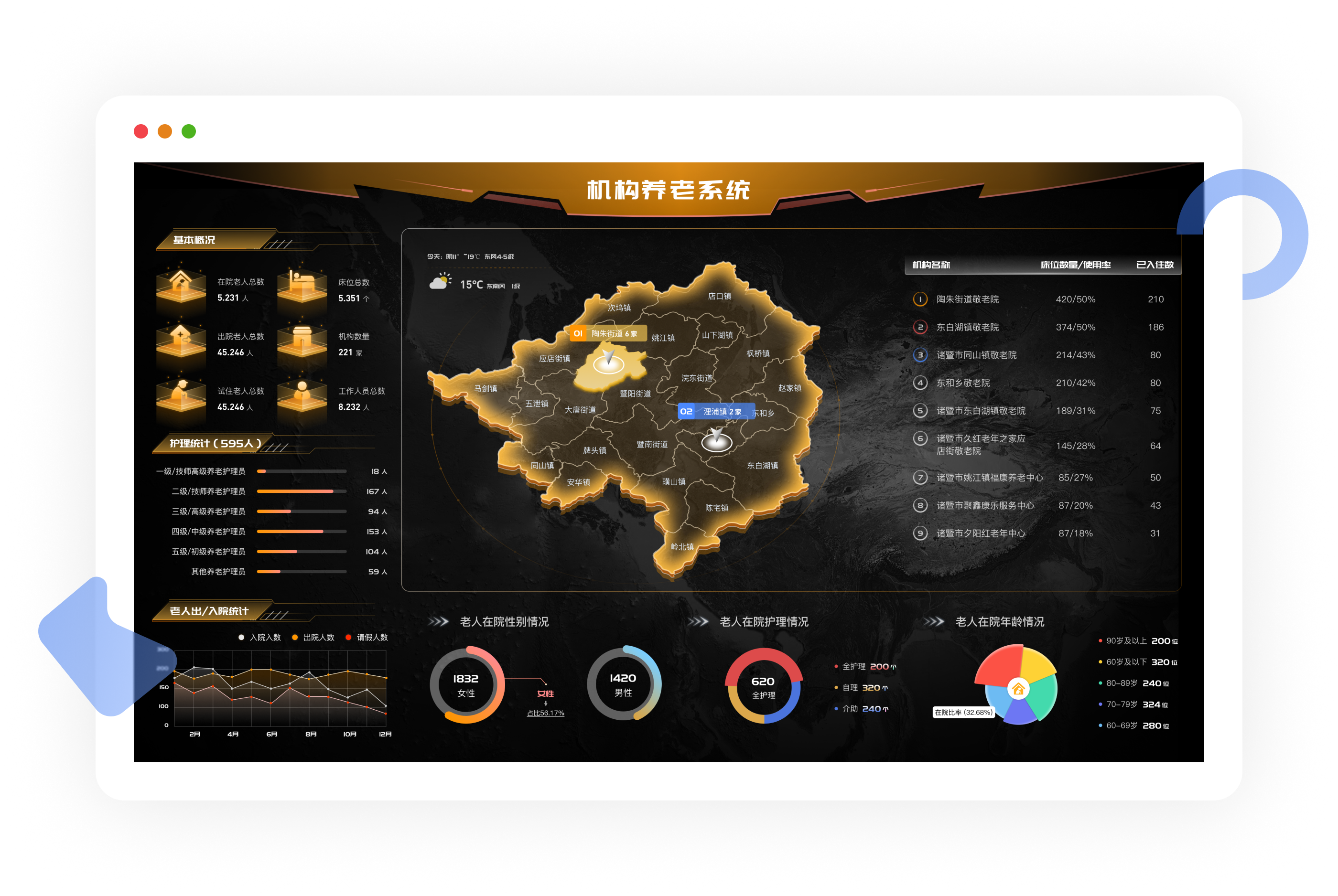 将养老机构全面纳管至平台,实现对养老机构日常运营的透明化、系统化、标准化、实时化管理。 建立机构养老信息数据中心,包含对机构信息、老年人基础信息、员工信息、服务人员信息、护理情况信息的管理。通过系统规范了入住 办理、护理服务、费用缴纳等业务流程,业务流程能够自动流转。以此实现数据管理的智能化、实时化,提高养老机构运营管理效率。