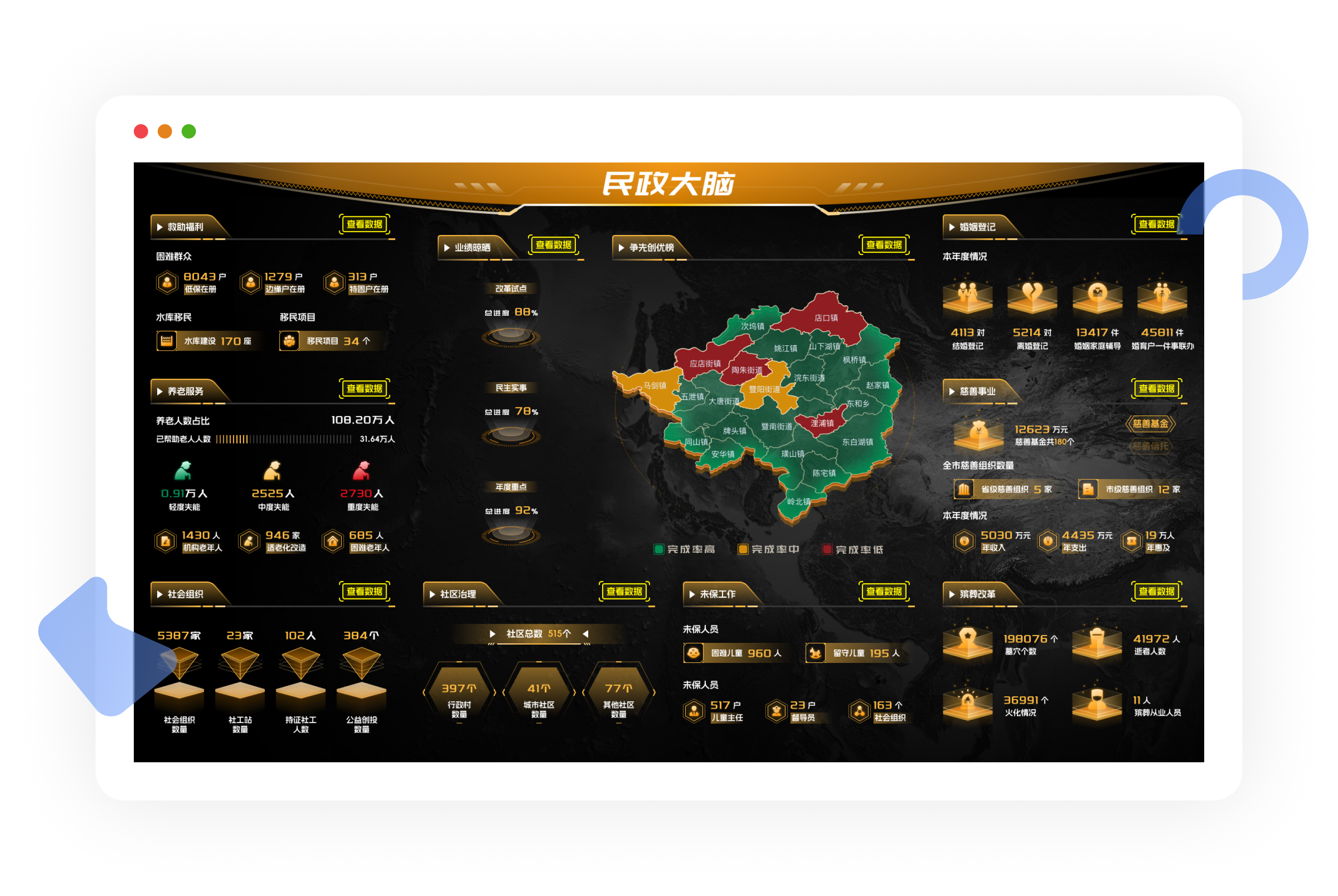 用民政数字驾驶舱使市域全覆盖、数据全归集,以“民政大脑”推动民政各部门精准服务,闭环管理,着力夯实“数智”社会民生底座。