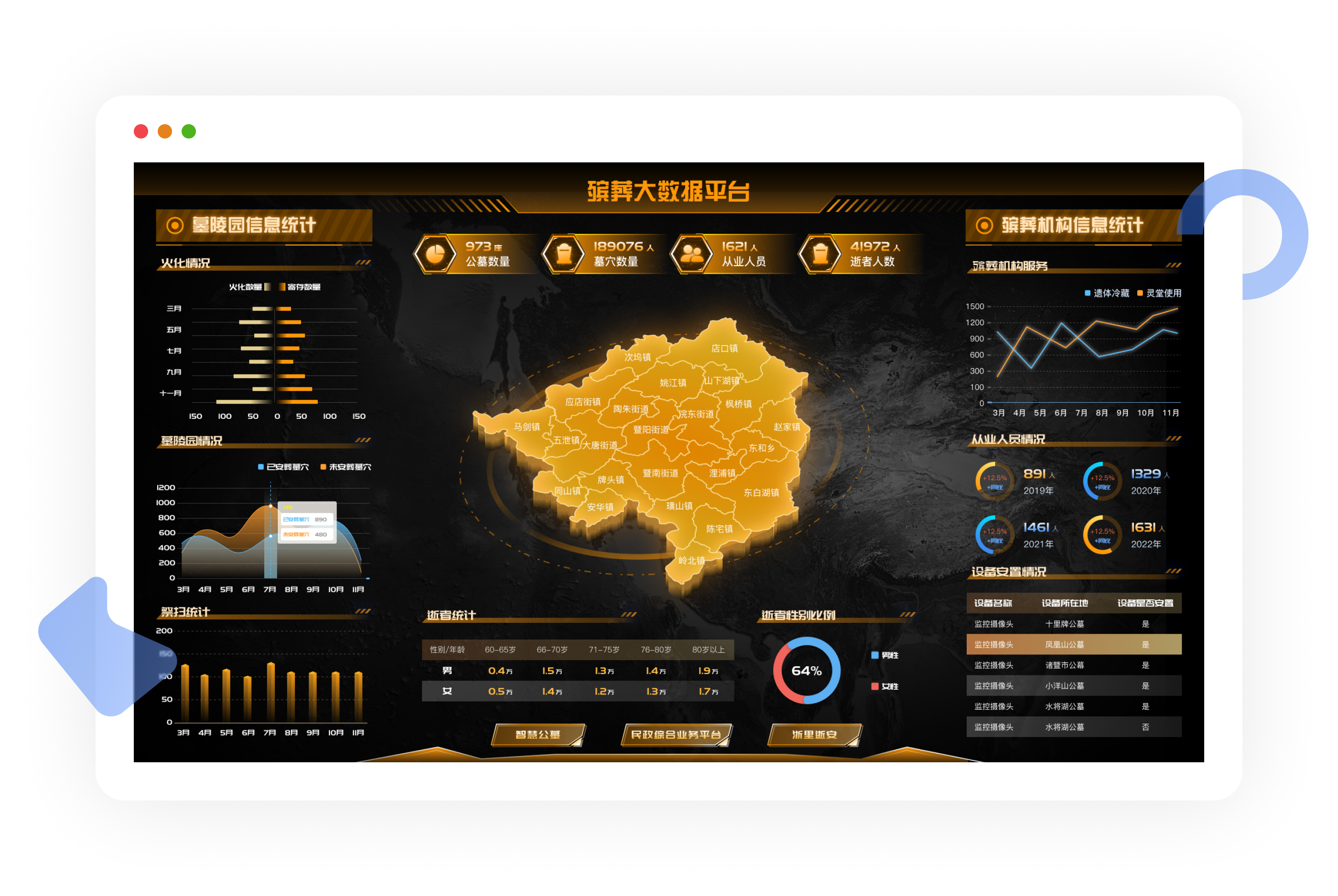 涵盖逝者申报、车辆调度、火化预约等殡仪馆所有业务实现数据管理的智能化、实时化,提高殡仪馆运营管理效率。
